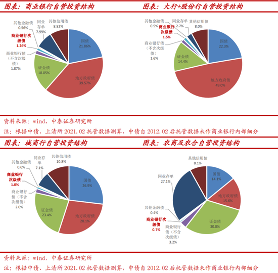 次级债风险权重调升,符合之前预期,对二级资本工具投资影响不大;次级债在银行表内投资占比较小,对银行的风险加权影响较小。1、虽然二级资本债投资者结构中,商业银行持仓占比不低,但银行抛售的可能性不大。银行资本工具多以互持为主,不会轻易抛售。若表内资本实在有压力,会用表外理财做承接。二级资本工具投资者结构中,商业银行占比接近30%,其中国有和股份行占25%,城商占3.5%,农商占2.5%。2、从银行自营投资结构来看,次级债占银行整体投资盘较小,二级资本债对自营投资全盘影响较小。整体商业银行自营投资次级债仅占大盘的1.3%,其中大行+股份行次级债配置占1.5%,城商行占1%,农商及农合占0.7%,中小行占比更低,二级资本债风险权重提升对其投资大盘风险权重的影响不大。