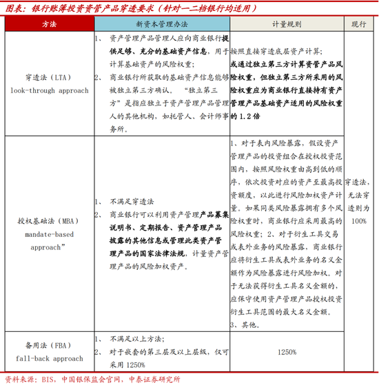 银行投资资管产品的穿透要求提升,针对一二档银行均适用,但在国内《商业银行大额风险暴露管理办法》实施多年的背景下,预计影响有限。新资本管理办法引入了巴Ⅲ最终版中对关于银行账簿中投资资管产品的三种权重计算方式,其中:1、方法一:穿透法要渗透到每笔底层资产计算权重,或通过独立第三方计算资管产品风险权重,但独立第三方所采用的风险权重应为商业银行直接持有资产管理产品基础资产适用的风险权重的1.2倍,此处是相较巴Ⅲ最终版的新增规定,目的是鼓励商业银行独立、直接穿透。2、方法二:授权基础法是不满足穿透法时,风险权重最高的资产按照允许的最高投资额度来计算,且风险权重按照同类型最高的计算。3、方法三:1250%权重,当产品不适用以上两种方法,或对于嵌套的第三层及以上层级,则只可实施1250%的风险权重。4、杠杆调整:杠杆调整是相较巴Ⅲ最终版的新增规定,针对穿透法和授权法计算风险加权资产的,新资本管理办法规定应对风险权重进行杠杆调整(最高1250%),Lvg是指资产管理产品的杠杆率,用总资产除以净资产,在授权基础法中,杠杆率可通过资产管理产品募集说明书、定期报告或管理此类资产管理产品的国家法律法规允许的最大财务杠杆进行确定。杠杆调整实质是要求银行在执行穿透时要将产品本身杠杆加回,我们观察到全市场货币基金平均杠杆率自22年Q2开始逐渐下调至1.06,非货基金平均杠杆率抬升至1.13,货基杠杆整体较低且有下行趋势,影响较小。