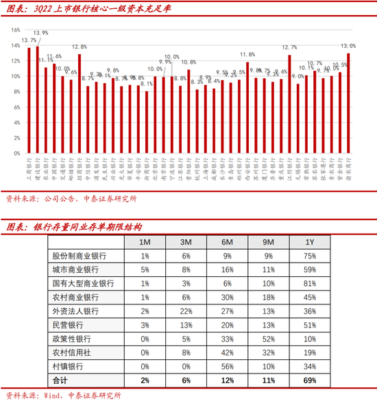 针对第一档银行,新资本管理办法沿用巴Ⅲ最终版中关于银行债权的权重比例调整。3M以上同业存单、金融债风险权重由现行25%提升至40%;信用风险评级低的银行发行的存单/金融债风险权重将提升更高。短期定义:原始期限3 个月或以内的风险暴露,以及已经因跨境商品流通产生的原始期限为6个月或以内的风险暴露均属于短期风险暴露。目前国内短期银行债权权重为20%,其他均为25%。银行债权分级:新资本管理办法参照巴Ⅲ最终版根据标准法分为ABC三级,短期A级权重为20%,非短期为40%,若A级满足核心一级资本充足率>14%且杠杆率>5%,则定义为A+级,可适用30%的权重。截止至3Q22,国内全部上市银行核心一级资本充足率均小于14%,平均为11.16%,3M以上银行债权无一适用30%。因此,国内上市银行主要为A级,在此背景下,3M以上期限的同业存单、普通金融债风险权重或由25%至少上行到40%,有所抬升。从发行期限看,市场发行3M以上存单占总发行存单的92%。当前货币政策整体环境仍相对宽松,短期看对同业存单发行市场冲击较小。从投资者结构看,同业存单投资者结构中银行持有34%,其中农商行及农合行持有最多、占比12%,其次为大行、占比7.2%。金融债投资者结构中银行合计持有59%,其中国股行合计持有33%,农商行及农合行持有15%。