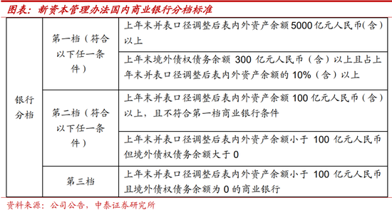 相对比巴三最终版,国内新资本管理办法主要区别在于两点:一是将银行划分为三个档次适应不同的资本监管体系。1、划分标准:按照银行资产规模及跨境业务规模,划分为三个档次,匹配不同的资本监管方案。其中,规模较大或跨境业务较多的银行划为第一档,国内上市银行主要为第一档银行,基本对标资本监管国际规则;资产规模和跨境业务规模相对较小的银行纳入第二档,实施相对简化的监管规则;第三档主要是规模小于100亿元的商业银行,进一步简化资本计量并引导聚焦服务县域和小微。2、分档调整规则:(1)对于第一档商业银行,无论后续是否符合第一档商业银行标准,均应适用第一档商业银行的信用风险加权资产计量方法、操作风险加权资产计量方法、资本充足率监管要求和信息披露规定。(2)对于第二、三档银行,若连续四个季度均符合提档标准的,则应提档并报监管,自第五个季度起适用相应档次资本监管标准。二是在信用风险计量中具体项目风险权重略有调整。下文将分类展开,整体预计节省资本约1.2万亿,核心一级核心资本预计提升0.17个百分点至9.29%。