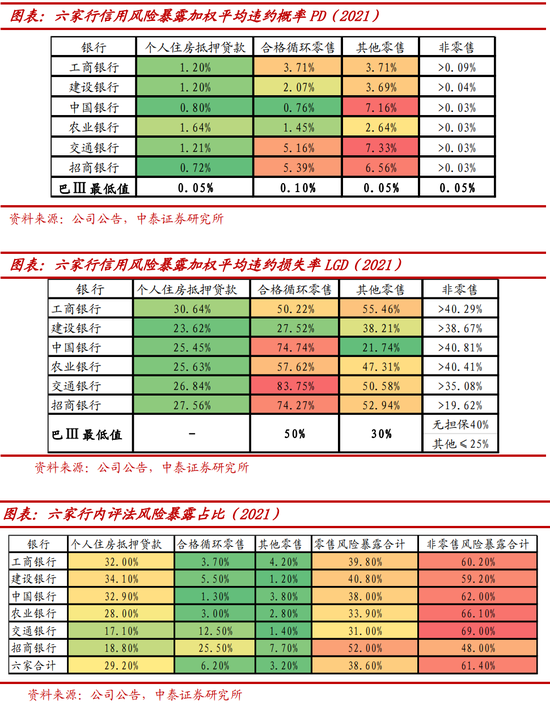 从国内实施内评法的六家行来看,非零售风险暴露占比61%,个人住房抵押风险暴露占比29%,合格循环零售占比6%,可见合格循环零售占比最小,因此其PD上调影响不大;非零售占比最高,PD调高,LGD最低值调低,预计有一定的相互抵消作用。