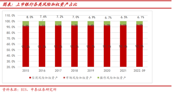 参照我们在《深度拆解|巴Ⅲ最终版落地在即,银行行为变化及资本影响测算》中的分析,重点分析第一支柱中的信用风险计量。一支柱中的风险加权资产包括信用风险加权资产、市场风险加权资产、操作风险加权资产。原因之一为新资本管理办法规定的主要量化指标指标与目前国内施行基本一致。其二是国内银行信用风险是分析风险加权资产的核心,截至22年三季度末,信用风险加权资产占总风险加权资产92.7%。