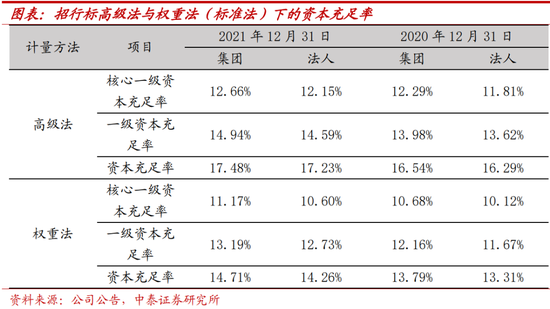 新资本管理办法规定股权风险暴露不得使用内评法计量信用风险加权资产,对以下风险暴露不得采用高级内评法计量信用风险加权资产:金融机构风险暴露、企业年营业收入(近三年营业收入的算术平均值)超过30亿元人民币或满足其他条件的一般公司风险暴露。根据2014年4月银监会发布的《工行等6家银行获核准实施资本管理高级方法》,工行、农行、中行、建行、交行和招商银行目前可实施资本管理高级方法,目前招行对公司信用风险采用初级内评法,对零售信用风险暴露采用高级内评法。招行标准法下的资本充足率、一级资本充足率、核心一级资本充足率分别为14.71%、13.19%、11.71%;高级法下的资本充足率、一级资本充足率、核心一级资本充足率分别17.48%、19.94、12.66%。