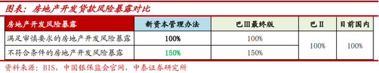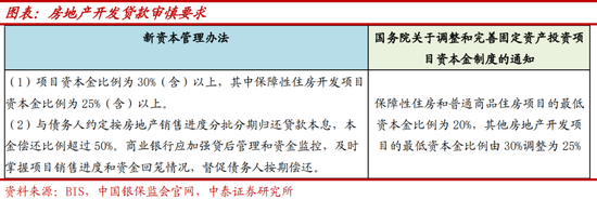 行业投向看,房地产开发贷方面,新资本管理办法沿用巴Ⅲ最终版权重调整,符合审慎要求的仍是 100%比例计提,与现行一致,否则为150%。新资本管理办法对“审慎要求”做出明确规定:项目资本金比例要 30%(含)以上,其中保障性住房开发项目资本金比例要 25%(含)以上,而根据 2015 年 9 月 9 日《国务院关于调整和完善固定资产投资项目资本金制度的通知》规定保障性住房和普通商品住房项目的最低资本金比例为 20%,其他房地产开发项目的最低资本金比例由 30%调整为 25%,因此新资本管理办法对房地产开发资本金比例的要求要严于现行规定。当然,商业银行在实操中会提高相关要求,比如将普通住房项目审批要求提升到 25%,而且往往住宅项目开工时会高于25%的比例,但保障性基本按照20%,其他也基本按照25%,因此整体看还是有一部分房地产开发贷款不符合审慎要求,将适用 150%权重。