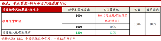 除一般公司贷款外,专业贷款运营前资本占用提升至130%;运营中项目权重100%,未采用巴Ⅲ最终版中“优质项目”的分类。专业贷款风险暴露特征(不包括房地产风险暴露):债务人通常是一个专门为实物资产融资或运作实物资产而设立的特殊目的实体;债务人基本没有其他实质性资产或业务,除了从被融资资产中获得的收入外,没有独立偿还债务的能力;合同安排给予贷款银行对融资形成的资产及其所产生的收入有相当程度的控制权。专业贷款细分为实物融资、项目融资和商品融资,其中项目融资特征是:用于建造一个或一组大型生产装置或基础设施项目,包括对在建项目的再融资;债务人通常是为建设、经营该项目或为该项目融资而专门组建的企业法人;还款资金来源主要依赖该项目产生的销售收入、补贴收入或其他收入,一般不具备其他还款来源。项目融资权重分类有所细化,运营前的项目风险权重设定为130%;对于在项目运营阶段的项目风险权重设定为100%,与现行一致。“在项目运营阶段的项目”需满足:项目现金流量净额为正,足以按期偿还剩余合同债务,且长期负债不断减少。银行对于项目融资业务更加需要加强甄别和预判,对于优质的项目融资(特别是优质基建类项目)的竞争更为激烈,对于一些处在运营前建设阶段的城投融资会提高风险权重。