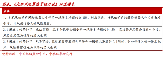 从国内现行政策来看,早在2018年,银保监通过发布《商业银行大额风险暴露管理办法》对银行投资资管产品或资产证券化底层资产进行了穿透的相关要求:根据基础资产是否可穿透进行分类,1)若能穿透,风险暴露小于一级资本净额0.15%的,允许银行不穿透,放在非同业单一客户,风险暴露值为投资的名义金额,接受风险暴露小于一级资本净额15%监管;若风险暴露大于一级资本净额0.15%,则需穿透到最终债务人接受监管,风险暴露值则根据是否分级采用不同方法计算,此处可对应穿透法。2)若无法穿透,基础资产投资金额小于一级资本净额0.15%的,可放在非同业单一客户,风险暴露值为投资的名义金额;若基础资产投资金额大于一级资本净额0.15%,则需放入唯一匿名客户,风险暴露值也为投资的名义金额。同时,监管要求在2019年末前达到匿名客户的风险暴露监管要求,在2021年末前达到同业客户的风险监管要求。从银行投资的产品种类来看,定制类的基金、定向资管计划、大部分ABS特别是以企业贷款为基础资产的证券化产品大部分能做到穿透到底层,像货币基金、零售类ABS、同业理财、集合类资管产品等产品则大多数可穿透到大类。由于监管规定基金季报要在季度结束后的15个工作日内披露,大部分基金实际是在临近截止日前披露,目前的季报披露时效并不能完全满足所有银行向监管报备的时效性,因此该类产品国内商业银行大都已经按照100%权重计量,且监管对于匿名户的规模已经压缩。若实在是无法穿透底层的流动性较高的产品,银行交易账簿也可以有一定的调节空间,针对目前资管产品底层披露机制与新资本管理办法之间存在的不适配性,下阶段监管或将针对性出台更为细致的操作指引,并且新资本管理办法留有10个月的整改期,届时新实施的穿透要求带来的风险权重变化将有限。