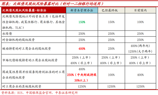 新资本管理办法参考巴Ⅲ最终版对银行次级债、股权及其他资本工具风险暴露进行了调整(部分股权投资权重调整不同),针对一二档银行均适用,次级债风险权重上调,股权权重仅有特定项目在条件下的下调。调整次级债及除股权以外的其他资本工具由100%上调至150%,永续债与现行250%一致;被动持有的工商企业的股权投资由现有区分持有时间变为统一400%,因政策性原因并经国务院特批的工商企业股权投资由现有400%调整为400%或250%(若中央财政持股30%以上)。