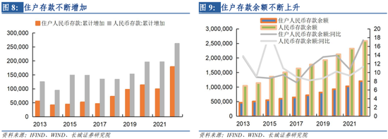 2022年出现超额储蓄主要是因为居民存款的大幅抬升。2022年人民币存款新增262654亿元,同比增长11.3%,其中住户人民币存款的增加占新增总存款的67.9%,是人民币存款增长的主要来源。数据显示,2022年住户存款新增178400亿元,比2021年多增65400亿元、比2019年多增81400亿元,同比增长17.4%,创近十年来最高增长,是2022年超额储蓄的主要原因。
