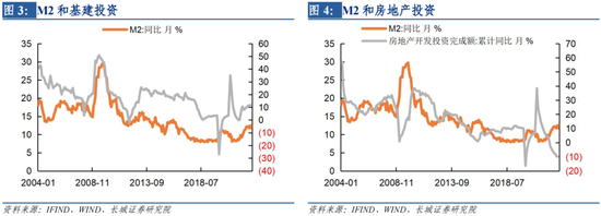众所周知,我国主要的固定资产投资为房地产和基建,而这两项投资也都需要大量的货币投入。据wind数据,房产开发投资额自1999以来基本一直处于高位,且从1999年到2014年几乎在两位数以上,月开发投资完成额累计同比平均值高达19.03%。基建投资近二十年也高居不下,从2004年以来(数据统计自2004年开始)的月投资累计同比平均值为17.38%,这个值跟房地产投资几乎不相上下,且自2004年至2018年区间几乎也都位于两位数以上,2009年中旬达到50%的高点。巨大的基建和房地产投资量使得我国M2长期处于高增长态势。
