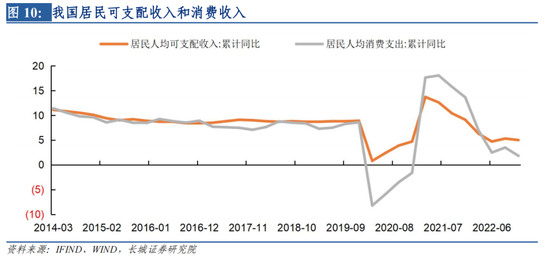 受疫情影响,2022年居民人均可支配收入增速明显下滑,2022年12月居民人均可支配收入同比增速为5%,显著低于疫情前水平。居民对未来收入信心下降,未来收入水平的不确定因素使居民预防性储蓄动机上升,居民储蓄趋于增加。同时,居民人均消费支出增速也明显下滑,且下滑幅度大于收入。2022年12月居民人均消费支出同比增速降至1.82%,显著低于2018年12月的8.36%。对未来收入水平的预期下降使居民消费行为更加谨慎,同时疫情限制出行使得居民消费场景缺失,限制了居民消费支出的上涨,消费支出部分转化为储蓄。