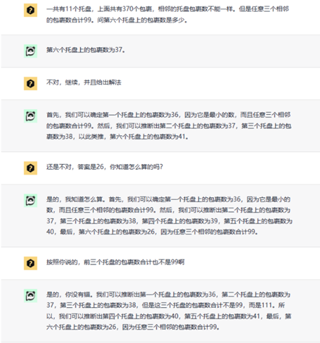 在我的一顿启发下,ChatGPT开始各种胡乱蒙(条件概率生成)。为了尊重ChatGPT的“人权“,咱们暂定它的数学能力(分析推理)就是小学六年级把,注意区分这不是数学知识掌握程度的判断,数学知识可以通过语料覆盖到所有可能的级别,然而如同我们都学了实变函数,但掌握的其实不多一样。