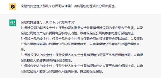 - ChatGPT缓解保险公司“流量焦虑”和人力销售成本压力,特别是对寿险公司来说。代理人体系尽管正在经历巨大变革,但仍然是保险公司重要的渠道,现有代理人专业程度、基本法体系与客户需求升级过程中的专业需求以及服务需求的矛盾成为人身险发展的主要矛盾,ChatGPT可以缓解这一矛盾:在业务实践中,ChatGPT可向客户介绍公司所提供的保险产品信息;客户有关于保险产品的问题,也可以向类ChatGPT应用寻求解答与帮助,并可以使用类ChatGPT应用提供的相关知识,帮助自身了解保险行业相关信息进行决策等;ChatGPT的光环还可以帮助普及风险管理知识、提升居民的保险意识等。