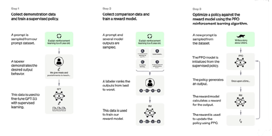 而InstructGPT是有公开资料的(图2),这是一个完整的三阶段步骤,这是一种混合“强化学习“和”模仿学习/比较学习“的方案:类强化学习是体现在第二步构造奖励模型(函数)并用于第三步;模仿学习一是因为其第二部训练方式采用了排序(偏好)方法(InstructGPT原始论文),第二是其对损失函数的构造包含了一部分(权重)调整的GPT3输出(即以GPT3作为目标,这形成了迭代升级关系)。可以设想,New Bing所使用的GPT4也是在ChatGPT(GPT3.5)上进一步提升形成了。从人工智能视角,这又是一种系统性的增量学习过程。