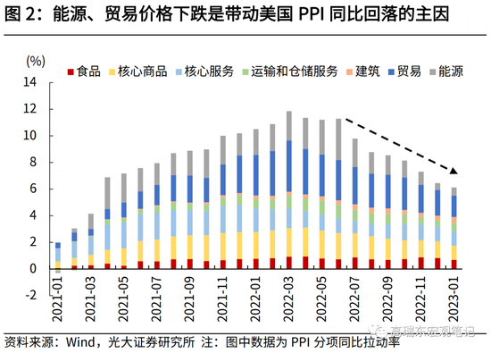 但是,前期通胀数据的降温仍然是以油价下跌为主导,而服务通胀并未放缓,仍处在高位。CPI方面,自2022年6月至2023年1月,美国CPI同比自高点9.1%降至6.4%,共下降2.7个百分点。其中,能源、核心商品价格分别贡献3.0、1.2个百分点的同比降幅,核心服务价格贡献1.1个百分点的同比涨幅。同样,PPI方面,2022年6月至2023年1月,美国PPI同比自高点11.1%降至6.0%,共下降5.1个百分点。其中,能源、贸易、核心商品价格分别贡献2.5、1.4、0.9个百分点的同比降幅。