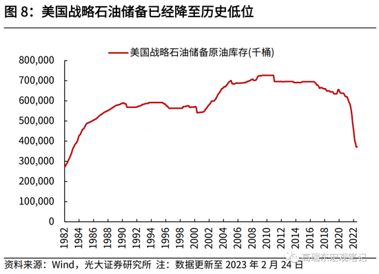 二是,美国存在回购战略石油储备的需求。去年10月,白宫曾承诺,当油价在每桶67至72美元或以下时,政府将会回购原油以填充战略石油储备。此前,美国为了平抑高汽油价格,2022年3月底宣布在6个月内从战略石油储备中释放1.8亿桶石油。截至今年2月初,美国战略石油储备库存降至3.7亿桶,达到近40年最低水平。今年4-6月,美国会再次释放2600万桶战略石油储备,此后库存将降至3.45亿桶,接近国际能源署要求的最低战略石油储备(要求成员国覆盖90天的净进口量,对应3.15亿桶)。