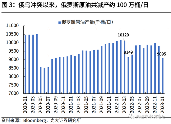 12月5日,欧盟对俄原油贸易制裁落地后,俄罗斯开始释放主动减产意愿。12月23日,俄罗斯方面表示,俄方可能在2023年初将石油产量削减5%至7%,并停止向支持对俄石油设置价格上限的国家进行销售。1月俄罗斯石油出现实质性减产,据彭博报道,1月俄罗斯石油产量降至910万桶/日,较12月下降72万桶/日,相较去年2月俄乌冲突前水平下降107万桶/日。2月5日,欧盟对俄成品油贸易制裁落地,2月10日,俄罗斯表示,为应对制裁,石油产量每日减少50万桶。