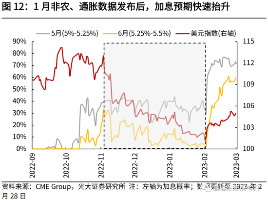 年初以来,由于国内需求恢复快于预期、欧美经济韧性强于预期,叠加俄罗斯原油主动减产,油价开始企稳反弹,导致1月美国通胀环比跳升。市场因此担忧若未来油价进一步上涨,会再度推升通胀上行风险,引发加息预期持续走强。