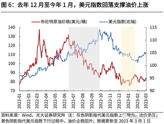 去年12月以来,油价企稳主要源于供需、流动性等多因素转向。一是,中国疫情快速过峰,经济复苏推升原油需求。二是,欧盟对俄制裁落地,俄罗斯石油开启主动减产。三是,前期加息预期趋缓,美元指数由强转弱。
