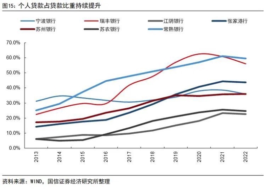 近年来各家银行个人贷款占贷款总额比重持续提升,个人贷款风险相对更分散,且逆周期属性强于对公贷款。同时,部分银行信贷投放区域也更加分散。以宁波银行为例,宁波银行信贷投向宁波市的比重从2013年末的51.95%降至2022年6月末的42.04%,加大了江苏、上海、广东、北京和安徽等区域的投放。瑞丰银行近年来也大力进军义乌市场。苏州银行、张家港行、常熟银行等也是持续加大异地信贷投放。由于信贷投放结构和区域更加分散,我们预计出口下滑对其经营的冲击也会有所减弱。