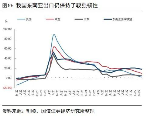 欧美日出口大概率负增,但东南亚预计仍能保持较好增长。伴随欧美经济持续回落,我国对欧美日的出口自今年7月以来呈现持续大幅下降的态势,预计2023年增速进一步回落至负增长。同时,地缘政治风险也会对出口带来冲击。但近年来我国东南亚出口一直保持强劲,占我国出口总额的比重已提升至约16.0%的水平。预计2023年东南亚出口仍将保持韧性,部分对冲欧美出口的大幅下降。