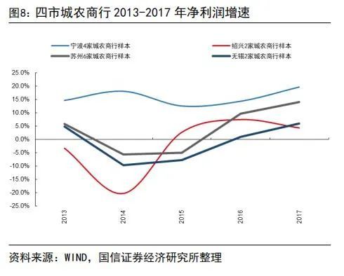 第一轮出口下滑周期(2013-2016年):2013-2015年浙江省金融机构不良率、贷款扩张速度均有所恶化,34家城农商行净利润增速也有所下降,但2016年各经营指标有所改善。2013-2016年江苏省金融机构各经营指标相对较为稳定,仅小幅下行。(1)不良情况:2015年末浙江省和江苏省金融机构不良贷款率分别为2.37%和1.49%,较2012年末分别提升了77bps和40bps,同期全国商业银行不良率提升了72bps至1.67%。但2016年末浙江省和江苏省金融机构不良贷款率分别降至了2.20%和1.36%。主要是2013-2015年我国经济内需也面临较大压力,主要是消化前期刺激政策带来的负面影响,银行业不良大幅暴露。2016年我国出口虽大幅下行,但随着前期刺激政策负面影响逐步消化,以及房地产去库存等政策效果的显现,我国经济进入企稳复苏阶段,因此江浙银行业不良率随之下行。(2)规模扩张:金融机构贷款增速自2010年开始大幅回落,2009年末全国、浙江省和江苏省贷款增速分别为31.74%、32.43%和36.10%,但2016年末已分别回落至13.5%、7.0%和14.5%,其中浙江省金融机构贷款扩张回落幅度最大。(3)业绩增速:我们主要选取区域部分城农商行作为样本。2015年浙江省34家城农商行整体净利润同比增长6.0%,较2013年增速回落了3.2个百分点;2015年江苏省30家城农商行整体净利润同比增长7.4%,较2013年回落了2.5个百分点。2014-2015年浙江省和江苏省业绩增速虽然都有所回落,但降幅明显低于全国商业银行降幅。另外,2016年浙江省和江苏省样本银行净利润增速则分别提升至10.9%和10.8%。