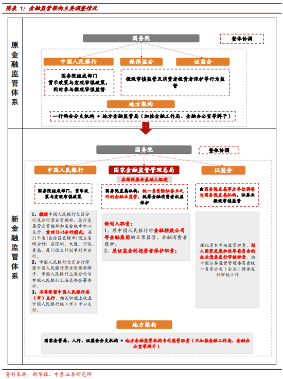 综上,结合我们对政府工作报告的分析,本次金融监管机构的改革的整体思路主要为:1)进一步加强对金融的全面领导和监管;2)全面地统筹防范和化解系统性金融风险。