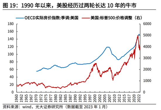 次贷危机后也呈现了类似的规律,2010年1月至2021年12月,标普500指数(经通货膨胀调整后)由1539.0点升至4976.5点,区间涨幅达223.4%,对应美国居民在权益上的资产配置占比由10.7%升至2021年的19.0%。但值得注意的是,2010年12月至2022年6月,OECD实际房价指数由90.8升至152.8,区间涨幅也达到68.4%,但我们并未看到居民资产在房产配置占比上的明显变化。