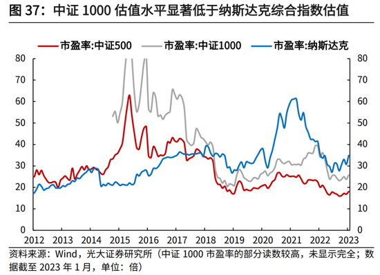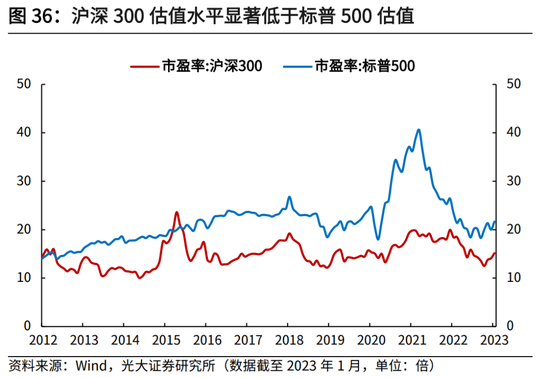 随着未来居民资产配置从地产到权益的转移,以及长线资金的加速入市,A股长期估值中枢有望抬升。当前我国A股估值水平长期显著低于美股,有较大提升空间。截至2023年1月31日,沪深300估值水平PE(TTM)为15.2倍,而同期标普500的PE(TTM)为21.7倍;中证500、中证1000估值水平PE(TTM)分别为18.1倍、25.7倍,显著低于纳斯达克综合指数的34.9倍。