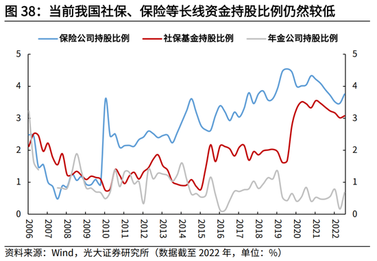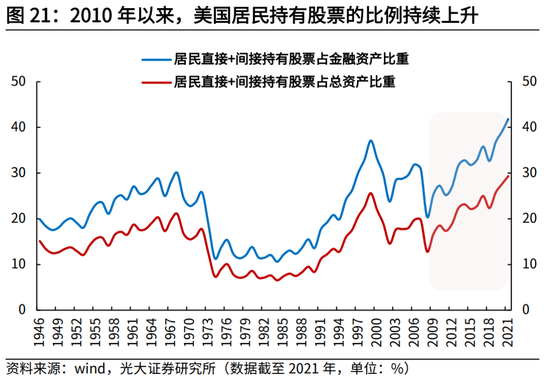 三是,长期资金的加速入市、机构投资者占比的提升对居民长期持有权益资产起到至关重要的作用。以养老金、社保基金为代表的长期资金是股票市场中最主要的机构投资者,在稳定市场运行等方面作用重大。美国经验看,美股长达十年的牛市背后也与养老金入市的规模持续提升相关。由于养老金具有限制支取的特征,使得居民实现长期被动储蓄,从而推高了居民持有权益资产的水平。