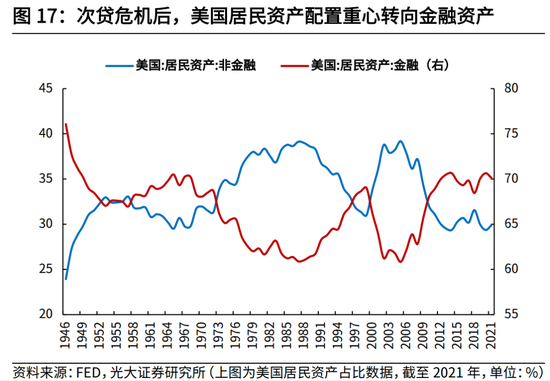 2007年次贷危机后,美国房地产价格的大幅下滑,使得居民部门的房产资产遭受重大打击。此后即使2012年房价开始企稳回升后,居民部门也没有出现明显增持房地产的现象。我们分析,这其中有人口、权益资产回报率等多方面的因素导致。