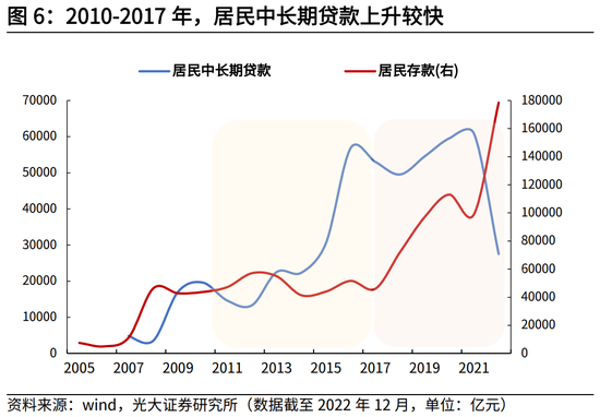 居民争相配置房产也使得居民房产债务持续上升,最终表现为居民杠杆率的快速上行。央行数据显示,2010-2017年,居民中长期贷款上升较快,但同期居民存款规模变动不大,可以侧面论证这一时期居民相当比例的资产配置流向房产;2017年之后,居民中长期贷款开始回落,相应地存款规模开始快速回升。从居民杠杆率来看,2010年至2020年期间是居民杠杆率上升最快的一段时期,区间上升幅度达36.6个百分点。与之对比的是,美国房地产火热时期(1997-2007年)居民部门杠杆率上升幅度为33.1个百分点。