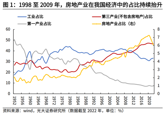 1998-2009年,是我国房地产市场发展的黄金时期,一系列地产扶持政策渐次出炉,房地产业定位为拉动国家经济发展的支柱产业之一,但由于工业贡献仍高,房地产并未成为宏观调控的主要抓手。这一阶段居民配置房产的偏好开始持续提升,但在居民资产负债表中房产更多还是满足居住属性的实物资产。