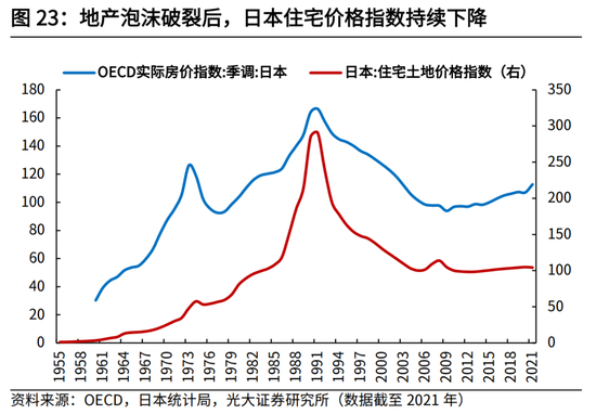 根据OECD和日本统计局的数据显示,1990年至2009年,日本实际房价指数(2015年=100)由163.9下降至93.9,降幅达43%;日本住宅土地价格指数(2010年=100)由284.5下降至104.8,降幅达63%。之后虽然房价略有回升,但幅度并不大,2010年至2021年间,日本实际房价指数仅上涨16.6%,土地价格指数仅上涨4.2%。