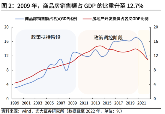 1998年2009年,是房地产市场发展的黄金时期,房地产业在我国国民经济中的占比持续抬升,但并未成为宏观调控的主要抓手。从商品房销售规模来看,1999年,商品房销售额占GDP的比重为3.0%,至2009年这一比例已升至12.7%,提升了9.7个百分点;房地产开发投资也成为固定资产投资的重要组成部分,其占GDP的比例由1999年的4.4%,升至2009年的10.4%,并于2020年升至14.0%。但这段时间,全球总需求快速扩张,我国经济依赖外向型出口加工,工业增加值对经济的贡献依然远高于地产建筑和服务业,房地产并未成为宏观调控的主要抓手。