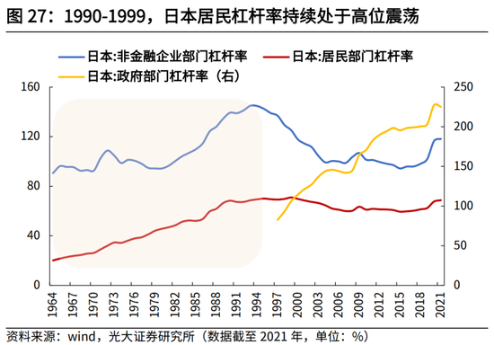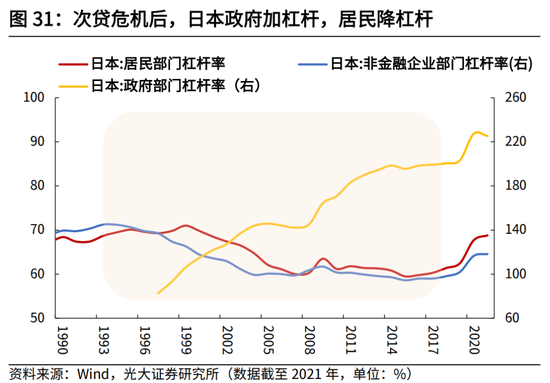 第二,地产后周期时代,美国和日本居民部门均经历完整的缩表周期,政府部门进入了较长的扩表周期,杠杆率持续攀升。美国方面,次贷危机后,美国居民部门的杠杆率由2007年的99.1%下滑至2019年的75.3%,疫情以来有所升高,但很快又再次回落至2022年6月的75.5%;日本方面,20世纪90年代地产泡沫破裂后,居民杠杆率并未过快下行,直至1997年亚洲金融危机后才开始显著下降,至2008年6月,日本居民部门杠杆率降至59.8%,此后基本围绕在60%左右震荡,疫情以来杠杆率有所上行,截至2022年6月上行至67.9%。
