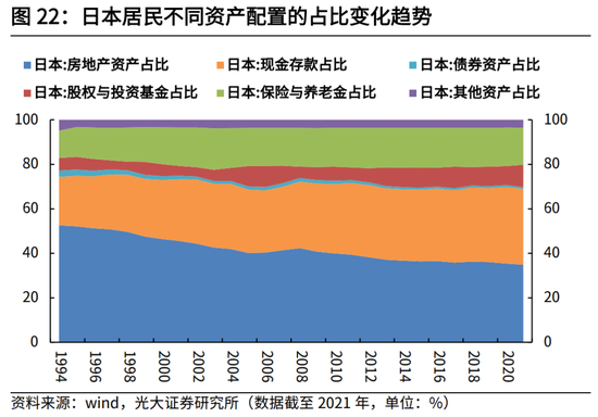 地产与权益资产的大幅贬值,叠加日本人口结构的深度变化,日本居民的资产配置结构也发生较大转变,现金与存款占比持续提升。从日本居民资产配置的细分项来看,1994年,日本居民现金存款在家庭总资产的占比为21.7%,至2012年,这一比例已升至32.4%,提升了10.7个百分点,养老与保险的占比也由1994年的12.4%提升5.8个百分点至18.1%;而同期房产占比下降15.8个百分点至36.8%,股权与投资基金占比变化不大。2012年之后,房产占比继续下降,现金和存款占比则持续回升,股权与投资基金占比则在日经225指数上涨的带动下,至2021年回升了3.7个百分点。