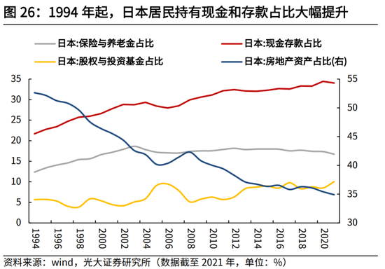 日本方面,居民资产更多转向现金和存款。房地产泡沫破裂后,股市也自此陷入长时间低迷。地产与权益资产的大幅贬值,叠加日本人口结构的深度变化,日本居民的资产配置结构也发生较大转变,现金与存款占比持续提升,1994-2021年,现金存款在日本家庭总资产的占比从21.7%升至32.4%。