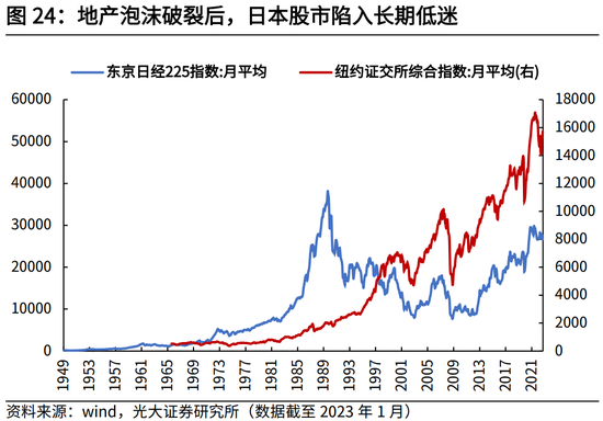 另一方面,地产后周期时代,美国和日本股票市场的收益率变化对于居民资产配置也产生了较大影响。次贷危机后,美股经短暂调整便进入一轮长达10年的牛市,2009年1月至2021年12月,标普500指数(1980=100)由723.4点升至4175点,区间涨幅达343.8%;而地产泡沫破裂后,日本股市经历了较长时间的低迷,1990年1月至2012年12月,日经225指数(1980=100)由549.5点降至153.6点,区间降幅达72%,2013年起股市才开始温和回升。