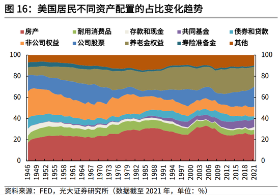 次贷危机成为美国居民资产配置转向的重要因素。次贷危机后,美国居民开始把资产配置的重点转向金融资产,表现为权益资产、共同基金的配置占比大幅提升。根据美联储数据,次贷危机后,居民新增资产配置到房地产的比重快速下降,从2002~2006年间的32.3%降至2011-2015年的24.4%,此后稳定在25%左右。与此同时,股票、基金以及养老金的配置占比逐步扩大,截至2021年,美国居民资产中股票、共同基金的占比上升至26.5%,养老金的占比也上升至18.8%。