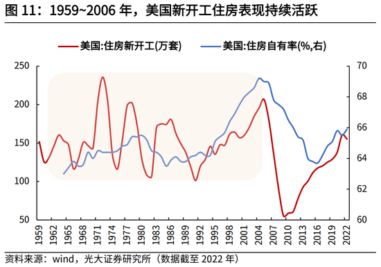 从历史上看,美国的居民资产配置结构经历过从地产到金融资产的转变。二战结束后至次贷危机前夕,美国房地产市场经历了长达60年的繁荣。根据达拉斯联储的房屋价格数据,1970年至2006年,美国名义房价指数上涨了531.3%,实际房价指数上升相对温和,上涨了95.4%。与房价持续上涨相对应,美国住房市场表现活跃,新开工住房持续高于100万套/年,居民住房自有率也快速提升,从1964年的63.0%提升至2006年的68.9%。