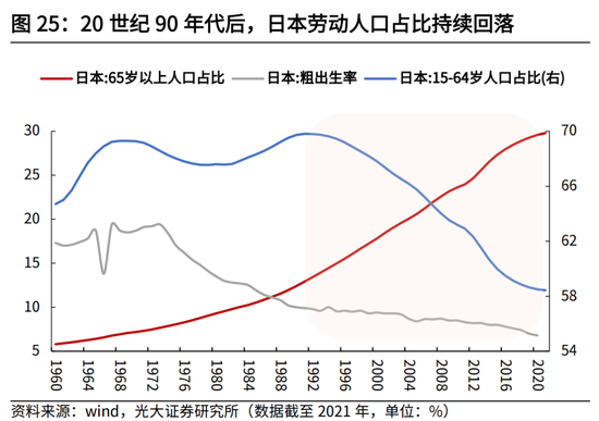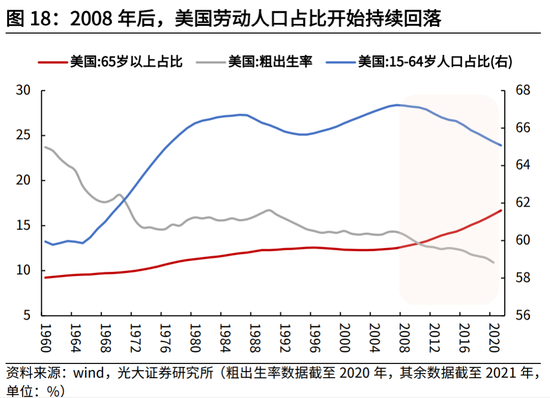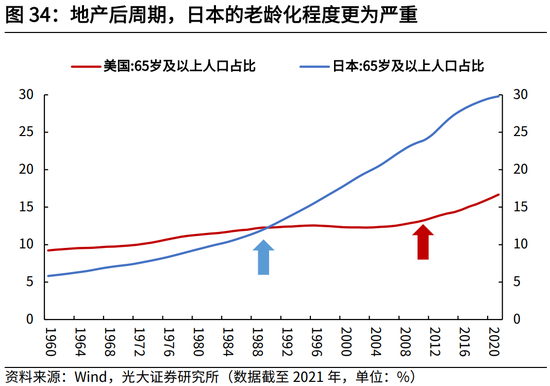当然这一方面与美日人口结构的差异有关,日本在1990年后加速步入老龄化,目前已接近深度老龄化的水平(2021年60岁以上人口占比达34.7%);而美国劳动年龄人口占比在2007年前后才达到峰值,截至2021年,美国65岁以上人口占比达16.7%,显著低于日本同期的29.8%。