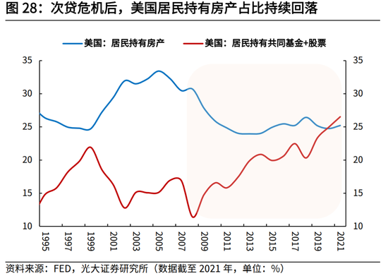 第一,进入地产后周期,美国和日本居民配置到房产上的占比在持续下降,即使后续房价有所企稳也并未改变这一趋势,截至2021年,美国和日本居民在房地产上的配置占比分别为25.2%和33.5%。