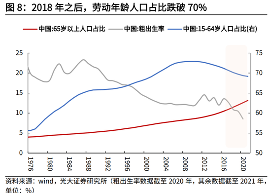 近年来,我国人口结构的变化也逐步呈现出地产后周期的特征。地产的周期变化本身就与人口密切相关,虽然人口及其相对结构是一个慢变量,但人口结构中蕴含着的经济增长、风险、债务等宏观经济力量往往会在人口转折期突然释放,导致资产价格的波动放大。