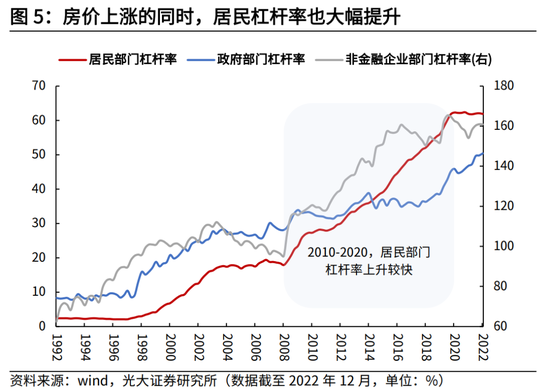 从这一时期居民的资产配置来看,虽然房价波动较大,但从较长时间来看,房价实现了较高涨幅,居民住房资产占比持续处于高位,杠杆率也居高不下。2010年至2020年,中国实际房价指数由96.9升至129.8,涨幅达34%,期间名义住宅土地价格指数涨幅达162%。分不同城市来看,一线城市房价涨幅明显高于二三线城市,2010至2020年间,一线城市住宅价格指数上涨102.4%,而同期二三线城市涨幅分别为64.4%、50.2%。
