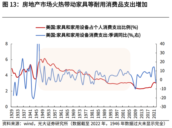 从经济拉动角度看,二战后至次贷危机前夕,房地产市场表现活跃,成为美国经济增长的重要推动因素。拆分美国GDP的占比来看,1946年至2006年,私人投资占美国GDP的比例平均值为17.4%,私人住宅投资占美国GDP的比例平均值为4.9%,显著高于二战前(1929-1945)以及次贷危机后(2007-2019)的水平,房地产市场的火热也带动了与之相关的耐用品消费的增长。