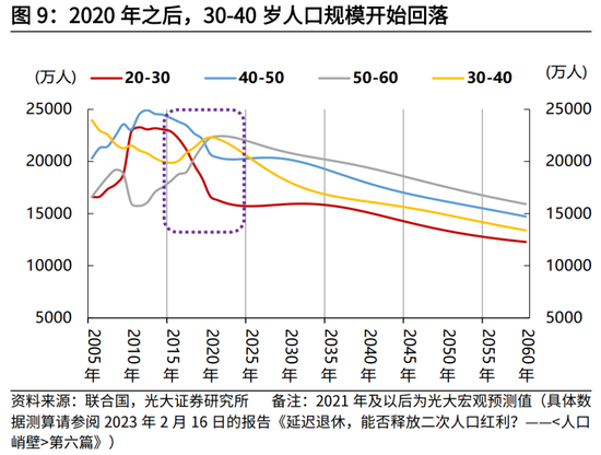 此外,我们也可以从刚需人口规模来观测住房需求的变化。一般来讲20-30岁、30-40岁的年龄段人口是最具住房刚需属性的人群,结合最近各地公布的初婚年龄,多地平均初婚年龄推迟,基本在27-30岁之间,平均结婚年龄大多在30岁以上,我们认为30-40岁人群更具住房刚需属性,包括改善性住房需求。从各个年龄段人口规模来看,我国20-30岁人口规模于2015年之后已经开始回落,2020年起30-40岁人口规模也开始回落,我国新增住房需求已然见顶。