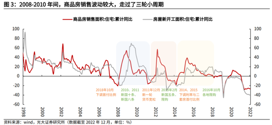 第一阶段:2008年至2011年,次贷危机后,为对冲经济下行,我国推出一揽子逆周期对冲政策,并以基建和地产作为主要抓手。2008年12月,“国十三条”出炉,放宽个人购二套普通自住房贷款比例,满足房地产企业合理融资需求。货币政策也同步启动,2008年9月至12月,央行执行了五次降息。2009年下半年开始,商品房销售增速和房价增速快速上行。为了防止房价过快上涨,2010年国务院发布“新国十条”,实行更为严格的差别化住房信贷政策,并上调首套房首付比例至三成;2011年1月,国务院再次发布“新国八条”,继续上调购房首付比例和贷款利率,调控出台后,效果立竿见影,房价环比增速迅速回落。