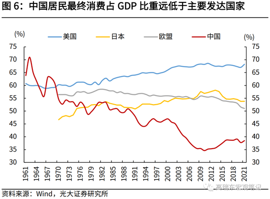 从海外经验看,大国经济具有消费为主导的显著特征,当前消费在我国经济中的占比仍有较大提升空间。具体来看,2000-2021年,美国居民消费占GDP的比重由66.0%升至68.2%,而同期我国居民消费占GDP比重则由47.0%降至2019年的39.1%,2021年进一步降至38.5%。2022年,中国的人均GDP已经超过12000美元,在迈过特定的发展阶段以后,在需求侧更多地靠消费拉动是经济发展的必然规律。