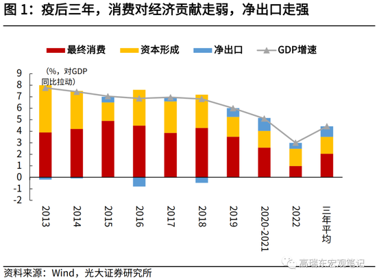 因此,扩大国内需求,尤其是恢复和扩大消费,是推动经济运行整体好转、提振市场信心的关键。疫情以来,由于消费场景受限、居民收入增长放缓、消费意愿降低等因素,国内消费市场整体疲弱,消费缺口长期存在。疫情之前(2015年至2019年),最终消费平均拉动经济增速4.2个百分点,对经济增速的平均贡献率达62.7%;疫情三年来,最终消费对经济增长的贡献率大幅回落至28.1%,平均仅拉动GDP增速2.0个百分点,最终消费尤其是居民消费,相较疫情前存在显著的产出缺口。消费的长期疲弱,不仅阻碍了经济的循环发展,也在一定程度上削弱宏观政策的实施效果。因此,今年政府工作报告提出“把恢复和扩大消费摆在优先位置”,将促消费作为扩内需的首选。