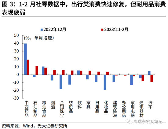 从消费恢复领域看,出行类消费快速复苏,但汽车、通讯器材、家电等耐用品消费表现较弱,与居民收入恢复偏慢、消费意愿尚未企稳有关。社零数据显示,餐饮、石油制品消费大幅好转,1-2月增速分别升至9.2%、10.9%。但通讯器材、家电、汽车销售较弱,1-2月同比增速分别为-8.2%、-1.9%、-9.4%。乘联会预计3月车市需求初步释放,3月狭义乘用车零售销量同比持平,但市场恢复速度低于此前预期。